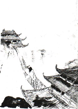 | [Linghu Chong, Fangzheng and Chongxu walked onto the suspension bridge. The bridge was only several feet wide. When one walked on the bridge, looked at the emptiness in all direction, and enjoyed the clouds flowing by under, it almost seemed to be in heaven. In such a wonderful spot, all three enjoyed the ease of mind!] |
